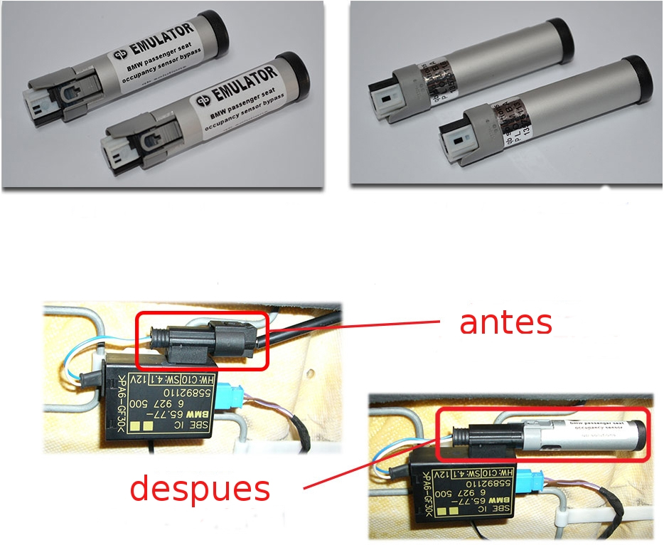 2. Buscar el sensor abajo de la silla del pasajero delantero en la parte trasera y quitar el conector original (según la foto de abajo).