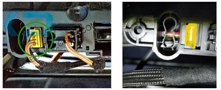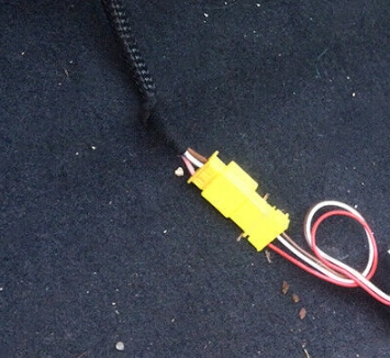El conector de la esterilla del asiento se encuentra debajo del asiento del pasajero. Se puede acceder desde la parte delantera del asiento. El conector tiene tres cables y una ranura vacía (Foto 1). Se conecta con un conector de tres hilos en colores: marrón, rojo, blanco. Necesitas desconectar el conector y conectarlo con el emulador (Foto 2).
