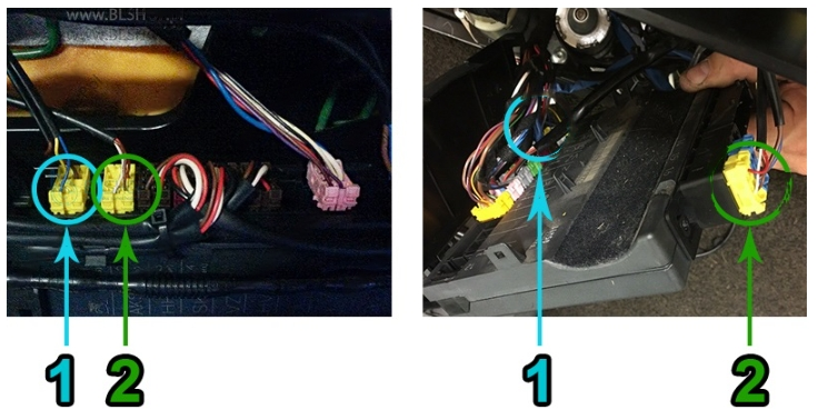 Foto 1. IZQUIERDA: parte delantera del mazo de cables. El conector de la esterilla del asiento está marcado como 2, la hebilla del cinturón de seguridad está marcada como 1.