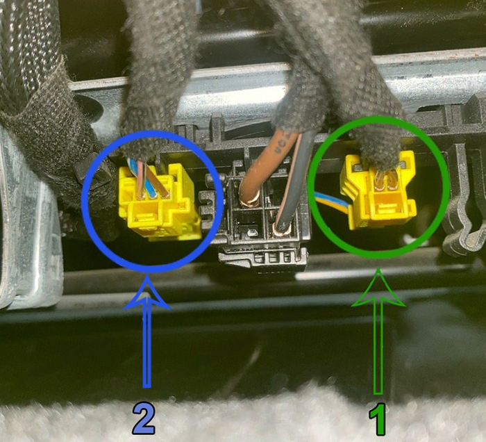 El conector de la esterilla del asiento y el conector de la hebilla del cinturón de seguridad se encuentran debajo del asiento del pasajero. Hemos marcado los conectores en la foto de abajo. Necesitas desconectar ambos conectores y conectarlos con el emulador.