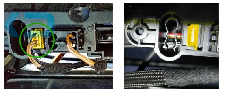El conector de la esterilla del asiento se encuentra debajo del asiento del pasajero. Se puede acceder desde la parte delantera del asiento. El conector tiene tres cables y una ranura vacía (Foto 1). Se conecta con un conector de tres hilos en colores: marrón, rojo, blanco. Necesitas desconectar el conector y conectarlo con el emulador (Foto 2).