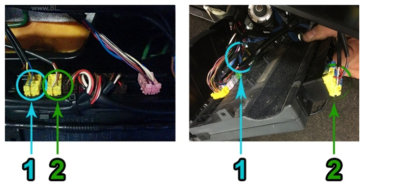 Foto 1. IZQUIERDA: parte delantera del mazo de cables. El conector de la esterilla del asiento está marcado como 2, la hebilla del cinturón de seguridad está marcada como 1.