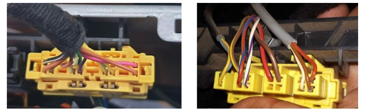 Foto 1. IZQUIERDA: lado frontal del arnés de cableado (NO desconecte ese conector). DERECHA: parte trasera del mazo de cables (aquí es donde conectas el emulador)
