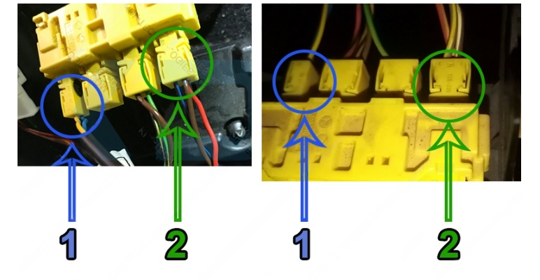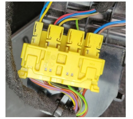 El conector de la esterilla del asiento y el conector de la hebilla del cinturón de seguridad se encuentran debajo del asiento del pasajero en el arnés de cableado amarillo. En la parte frontal del mazo de cables hay un conector amarillo grande con algunos cables (consulte la Foto 1). NO desconecte ese conector. Necesita estar conectado todo el tiempo. En la parte posterior del mazo de cables hay cuatro conectores. Estos son los conectores que te interesan.